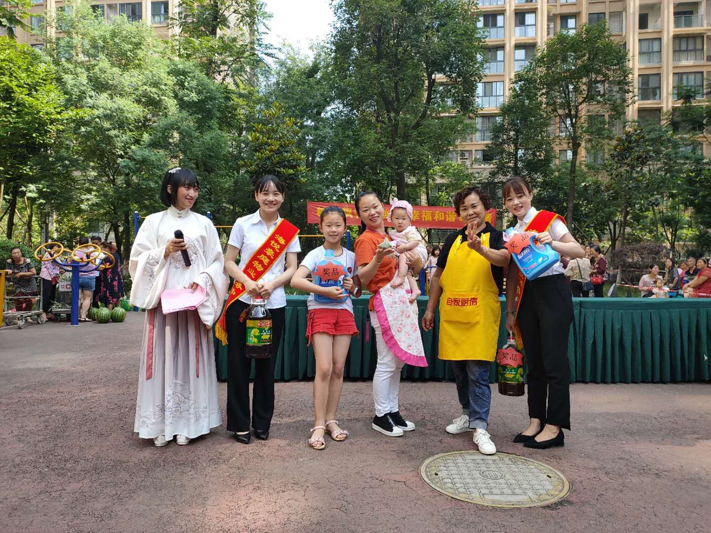 粽子包好了,开始煮粽子。煮了好一会儿,粽子煮熟了,此时整个小区里到处都弥漫着粽子的香味,小区里的老人、孩子终于可以吃到香喷喷的粽子了。粽子吃了,水果也吃了,由业主们评判出来的前三名选手意外获得了物业公司准备的精美奖品,拿着奖品的阿姨笑得合不拢嘴了。
